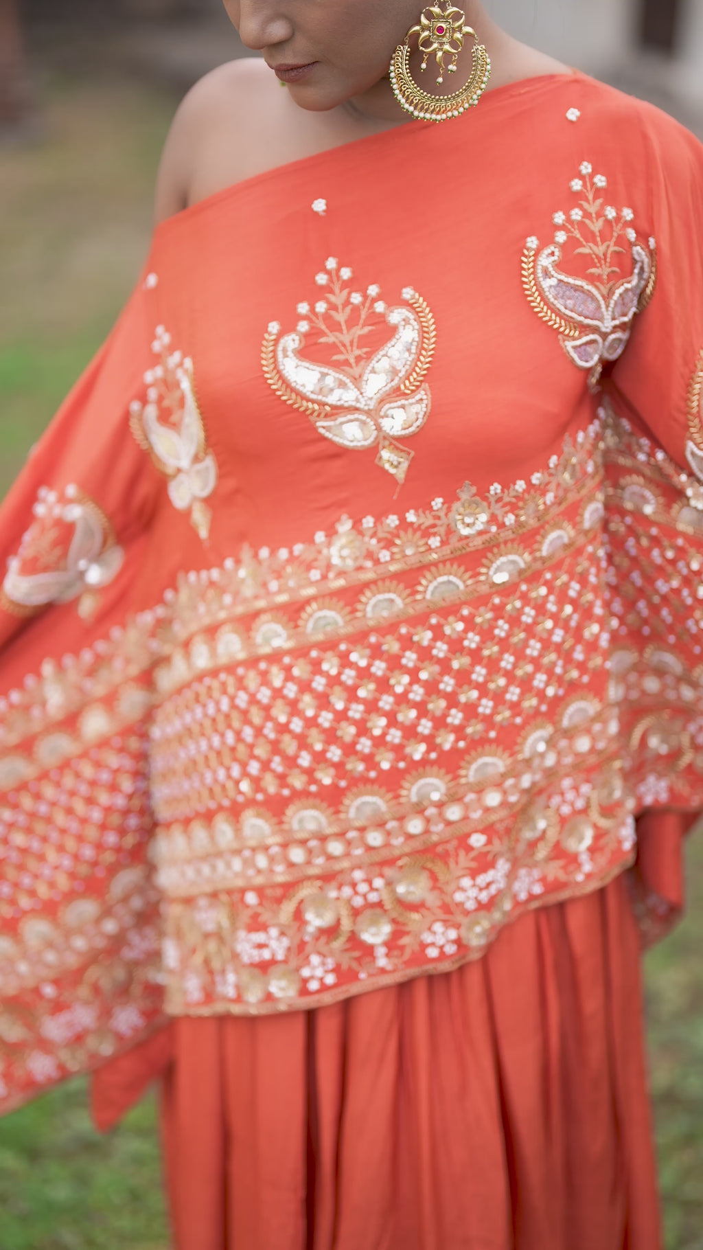 A striking expression of contemporary elegance with ethnic undertones, this orange designer top and skirt set is crafted from premium crepe silk, offering a smooth texture and graceful drape. The rectangular-neck top is enhanced with refined embellishments and delicate zari accents, adding a subtle festive shimmer. Paired with a beautifully flowing skirt, this ensemble creates a modern yet timeless silhouette—perfect for festive celebrations and special occasions.