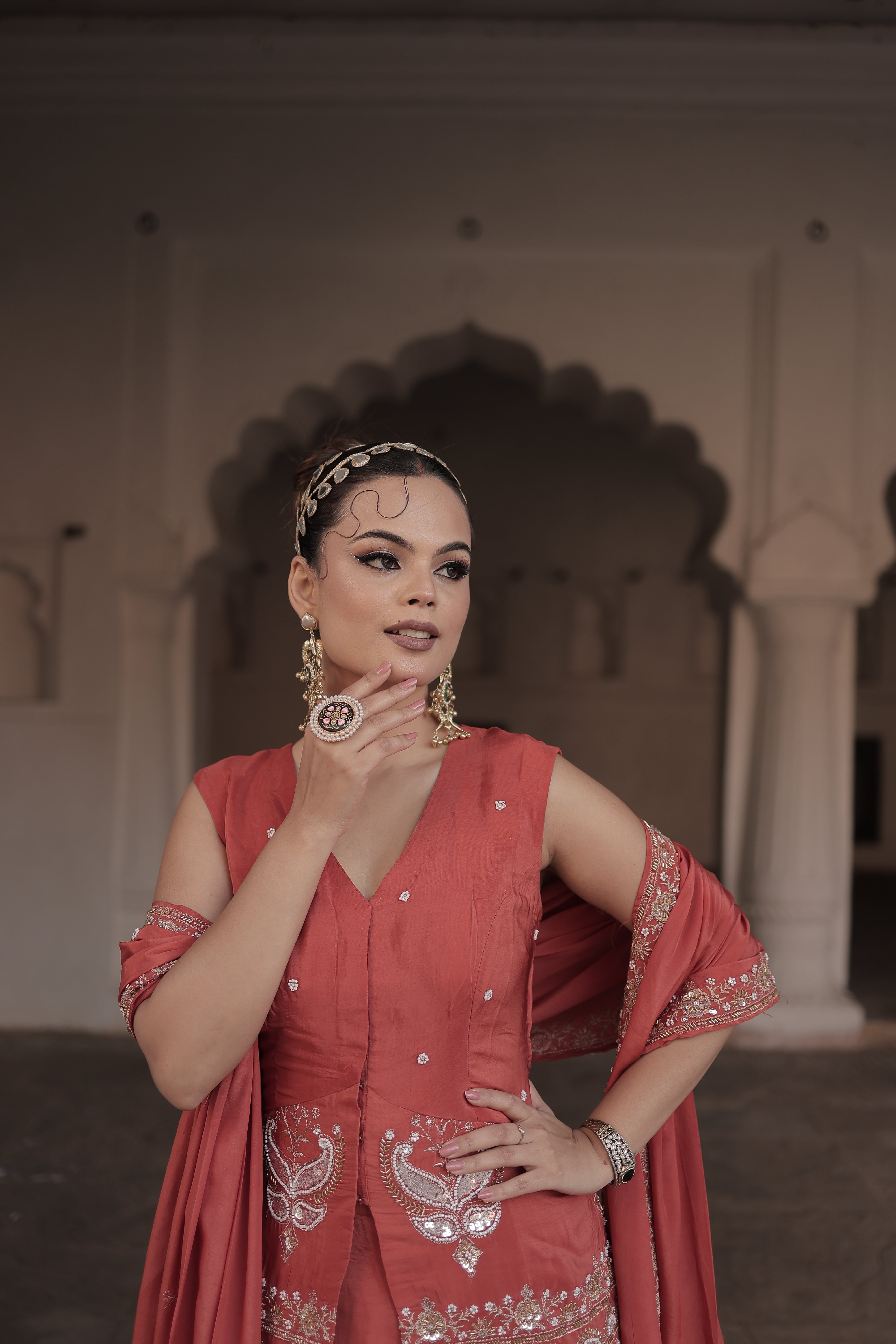 A graceful fusion of traditional sophistication and modern flair, this orange front-opening suit set is crafted from premium crepe silk, offering a fluid drape and a luxuriously smooth feel. The sleeveless kurti features refined embellishments with delicate zari accents that add a subtle festive shimmer. Paired with a beautifully flared sharara and a coordinated dupatta, this ensemble creates an effortlessly elegant silhouette perfect for festive celebrations and special occasions.