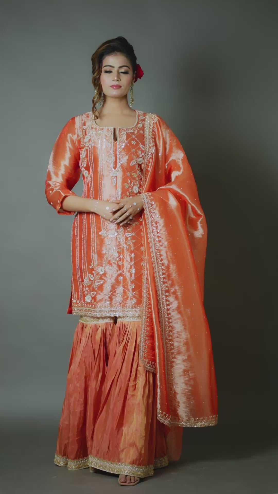 Orange Organza Kurta Gharara Set with Zari, Sequin & Pearl Hand Embroidery Work